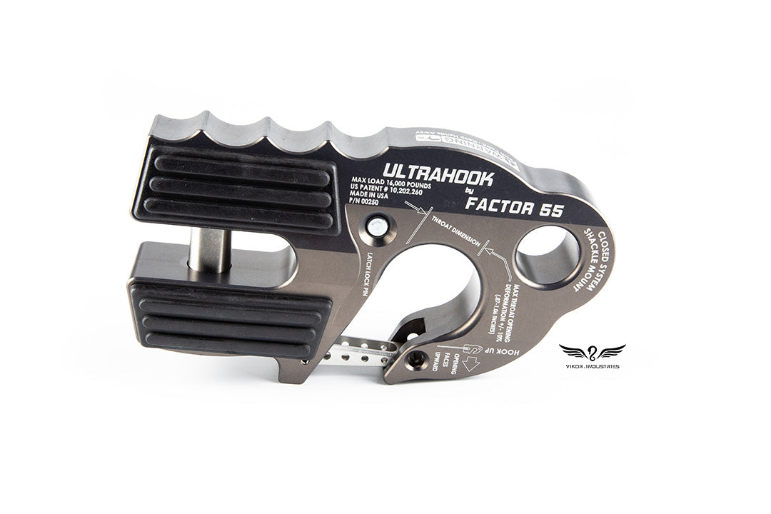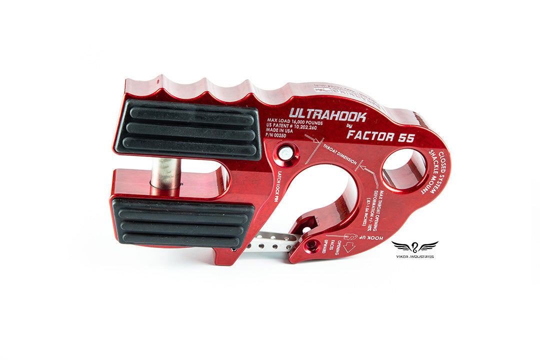 Featuring industry-first Closed System Shackle Mount hole machined into the body of the hook, safety latch retraction pocket resulting in a clear throat opening, integrated secondary safety latch locking feature-latch locking pin stored in the body of the Factor 55 UltraHook which can be removed and inserted in to the hook tip, locking the latch into place.